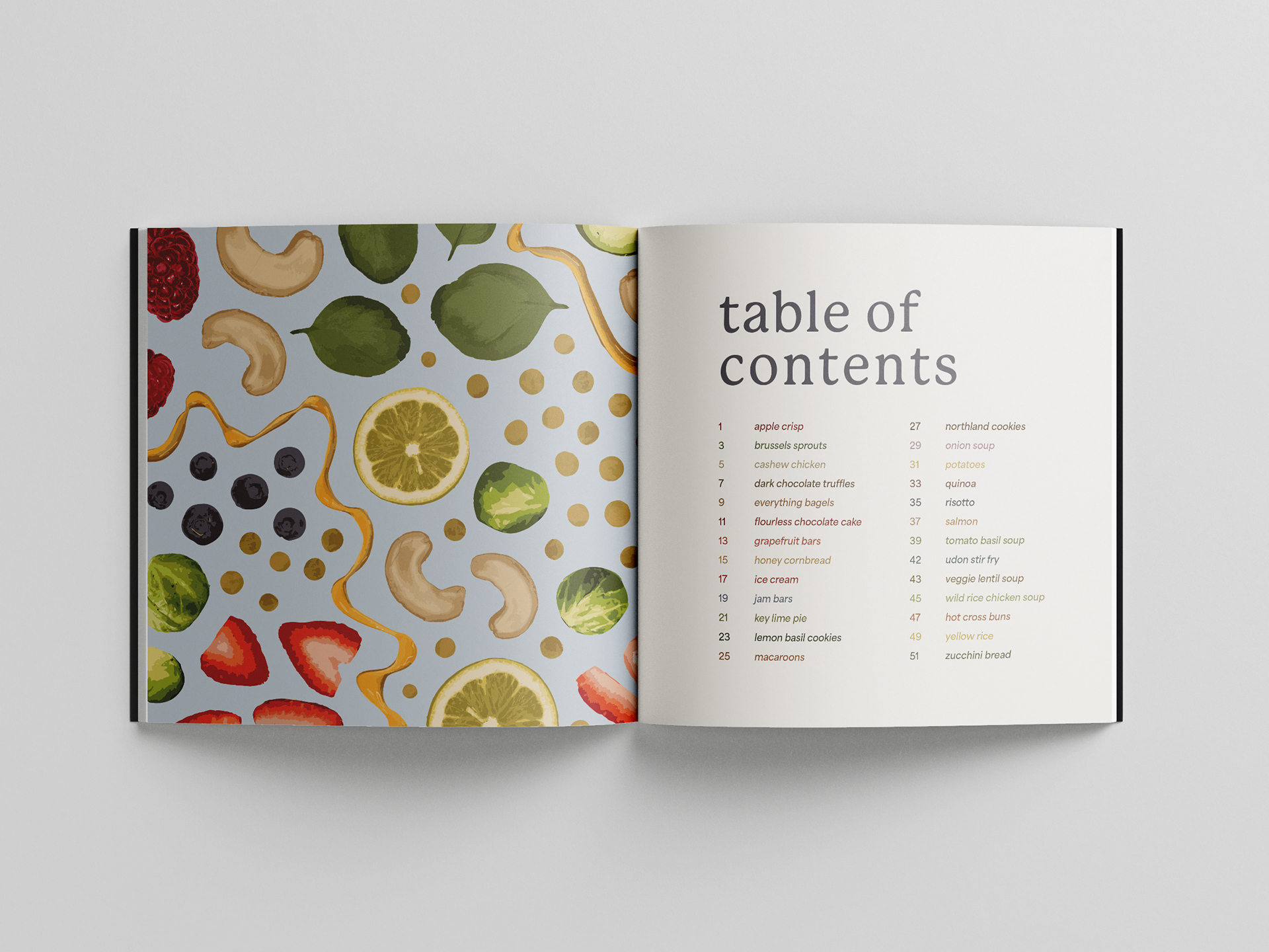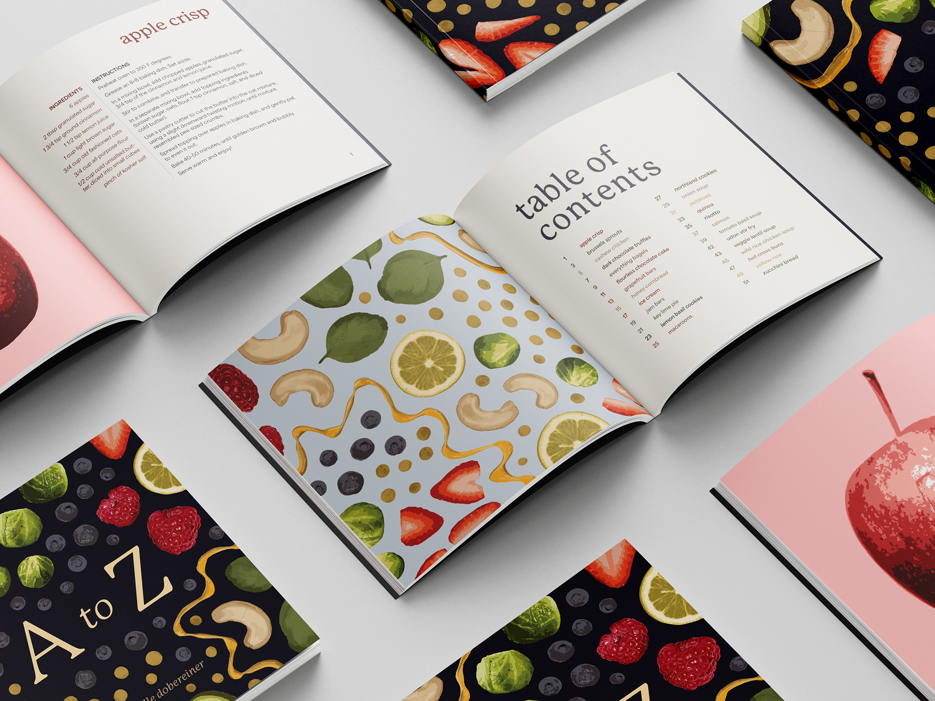 An alphabetical collection of recipes with accompanying letterforms. Each letterform was created using physical ingredients from each corresponding recipe and edited using Adobe Photoshop and Adobe Illustrator.